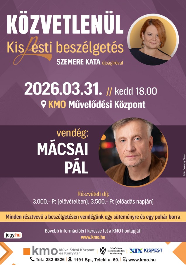 2026 március végén folytatódik Szemere Kata újságíró KÖZVETLENÜL – KIS(P)ESTI BESZÉLGETÉS című közönségtalálkozója, akinek vendége ezúttal Mácsai Pál lesz.