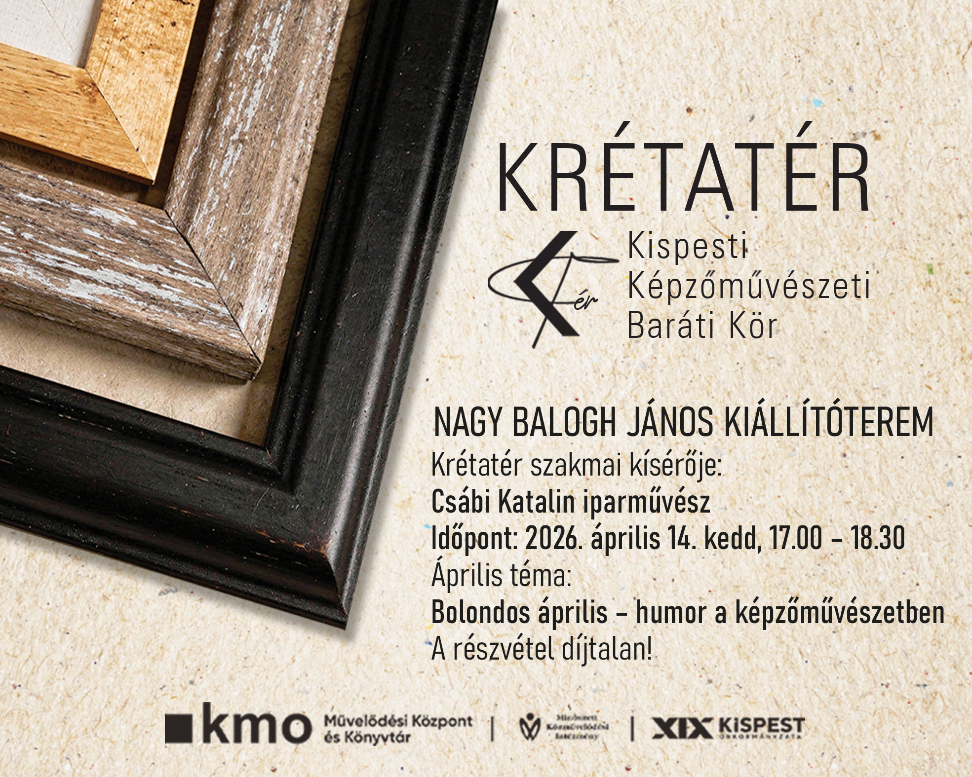 Új alkotóközösség indul a Nagy Balogh János Kiállítótérben. A KRÉTATÉR – Kispesti Képzőművészeti Baráti Kör klubfoglalkozásai március közepétől várják mindazokat, akik szívesen alkotnának, tanulnának és inspirálódnának egy támogató, kreatív közegben. Csatlakozz, és légy részese egy új művészeti közösségnek!