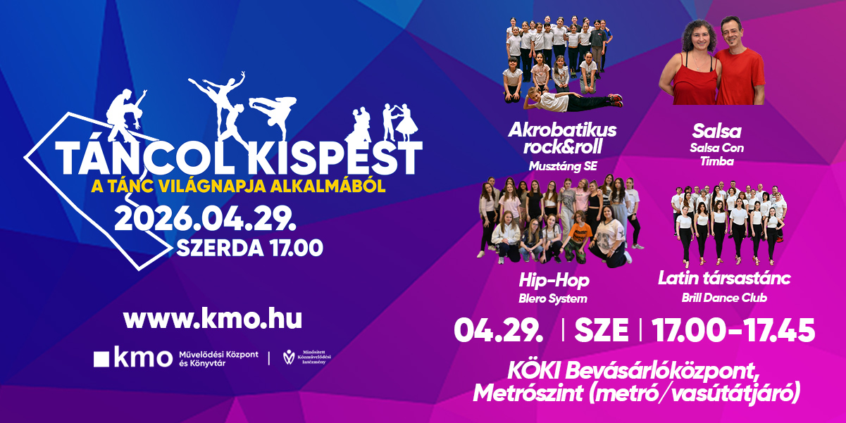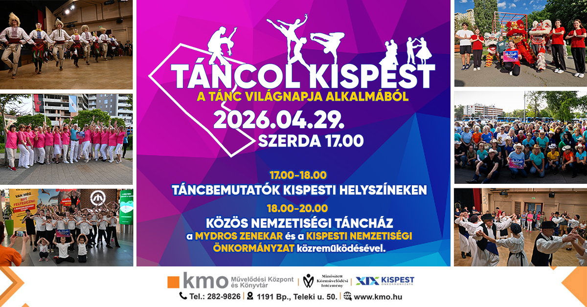 Második alkalommal mozdul meg Kispest 2026 áprilisban, a tánc ünnepén. A TÁNCOL KISPEST rendezvényünkön a Tánc világnapja alkalmából április 29-én, szerdán 17.00 és 20.00 között ismét a mozgásé és a ritmusé lesz a főszerep. Látványos bemutatók, közös tánc és felszabadult hangulat vár mindenkit, aki szeretné együtt ünnepelni a tánc sokszínű világát – immár másodszor Kispesten.