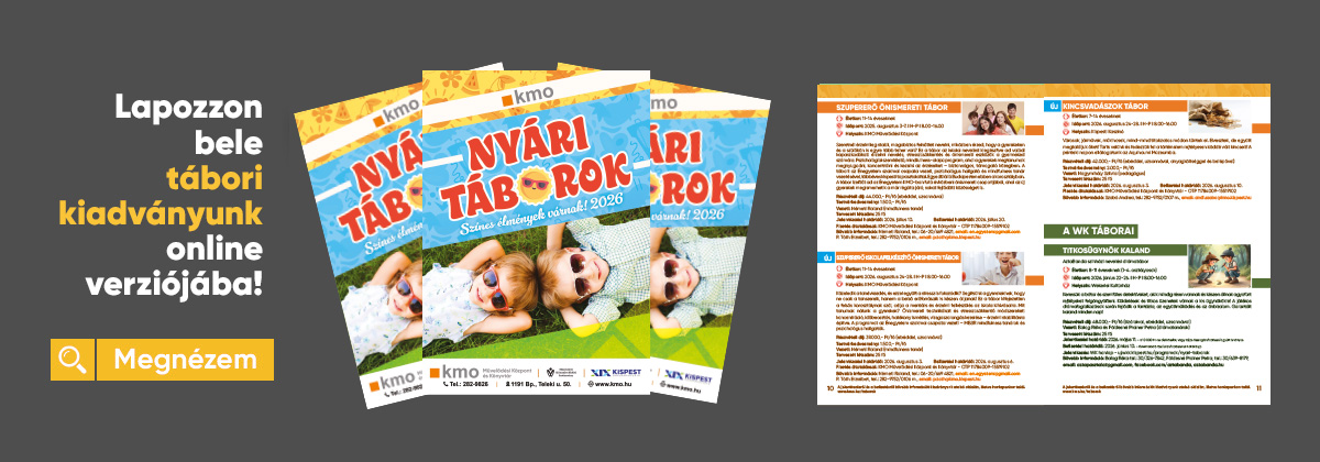 2026 júniustól augusztus végéig a KMO és tagintézményei tematikus táborokat szerveznek, melyekre már elindult az online jelentkezés. Tábori kínálatunk itt tekinthető meg: https://kmo.hu/taborok/. Lapozzon bele megjelent nyári tábori kiadványunkba: