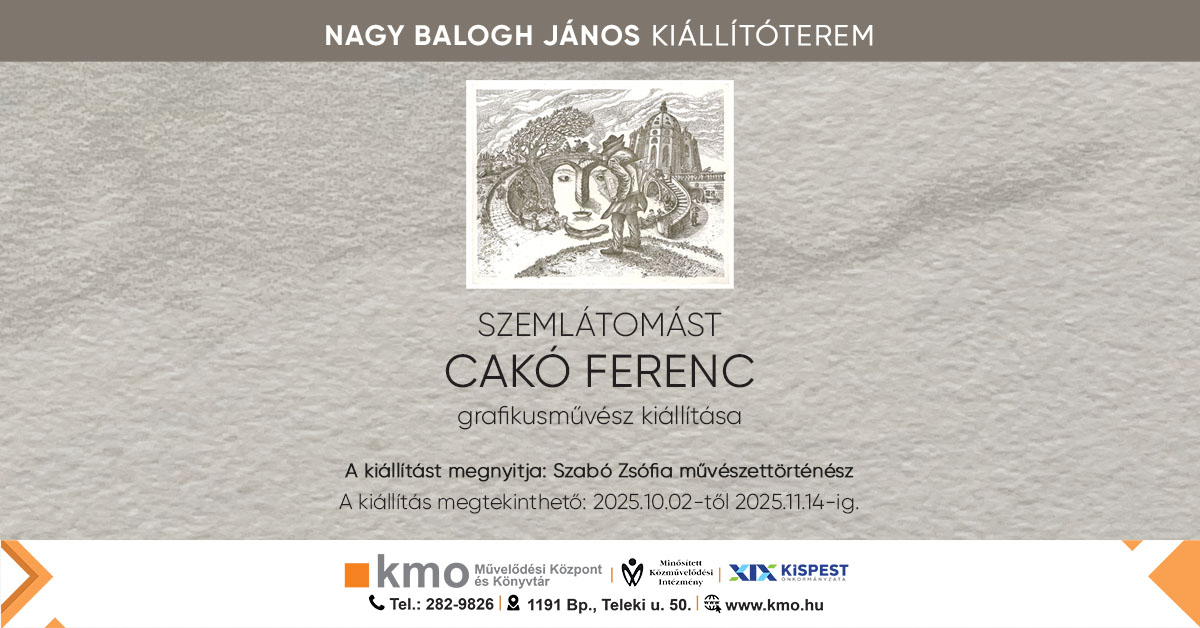 2025. október 2-án, 18 órától SZEMLÁTOMÁST címmel Cakó Ferenc grafikusművész kiállítása nyílik meg a Nagy Balogh János Kiállítóteremben.