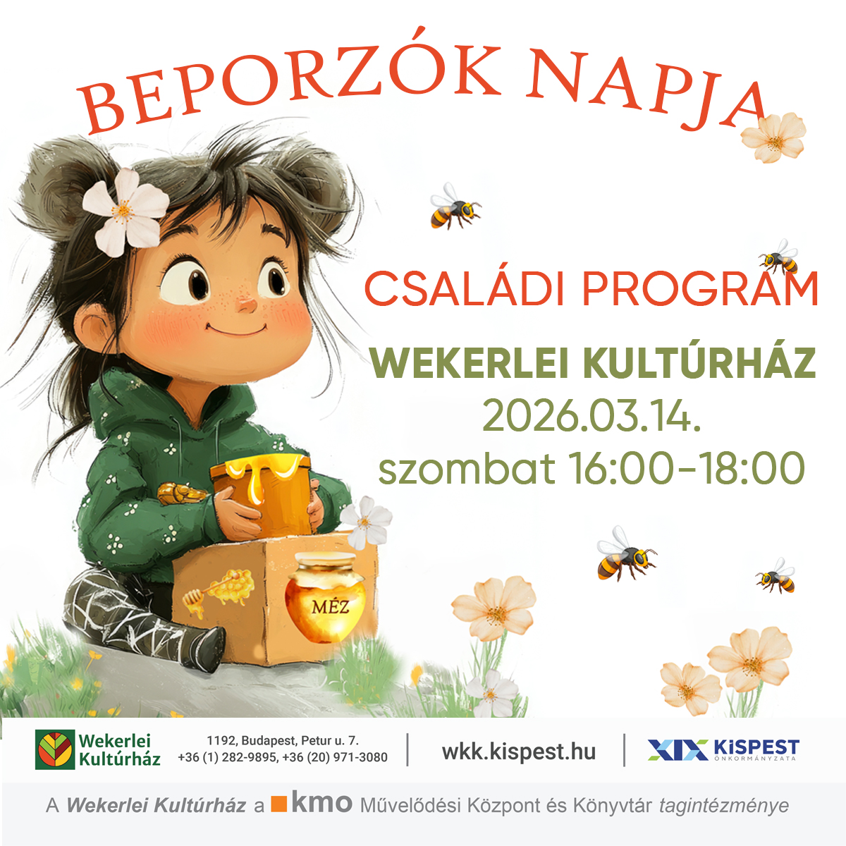 Zümm-zümm, akarom mondani, jöjjön-jöjjön, aki szeretné megismerni a méhek dolgos világát! Vendégünk a Csodabogarak Alapítvány Bogárháton projektje „A Méhkirálynő elveszett koronája” című interaktív mesével és játékkal igyekszik közelebb hozni a gyermekekhez a rovarok apró, mégis hatalmas világát. A délután folytatásában a Mézes Céh Szűcs Károly vezetésével Velün(n)k vagy nélkülü(n)k? kérdésével késztet bennünket gondolkodásra és gondoskodásra, a kézműves foglalkozáson pedig tavaszhívogató díszeket készítünk.