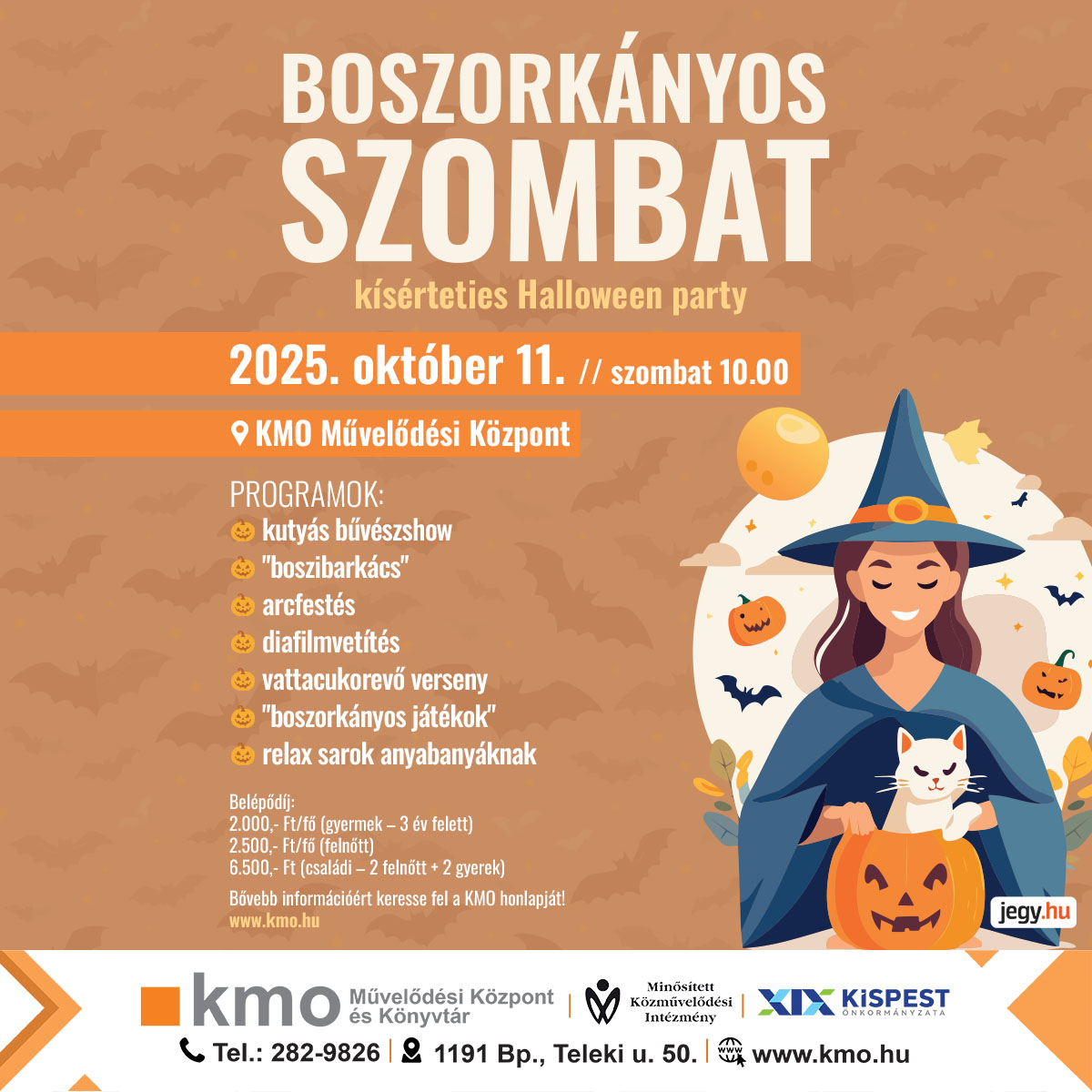 2025. október 11-én, szombaton 10.00-13.00 kísérteties Halloween party-t szervezünk családoknak a KMO Művelődési Központban, BOSZORKÁNYOS SZOMBAT címmel.